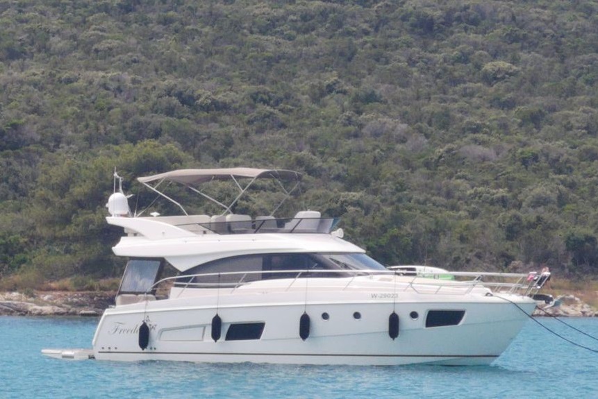 Camperverdeck, Badeleiter, Heckdusche warm/kalt, Fender, Kochfeld, Kühlschrank, große Sonnenliege, Beiboot, Außenborder